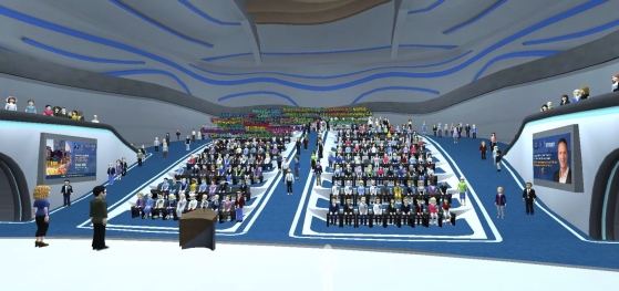 eXp Realityの情報は、Twitter @eXpWorldIR等にありますが、不動産エージェントたちが、仮想空間の会議室に集まってプレゼンテーションを観たり、会議をしたりしています。 一見すると一昔前の3Dゲームの画面のようですが、この一人一人が本物の人間(しかも真剣)に対応していると思うと、なかなか壮観です。