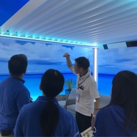 今年の展示会から、青いパーカー、ポロシャツのお揃いユニフォームで、さらにスタッフ一丸となってご案内しております。