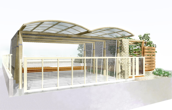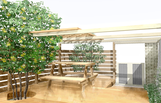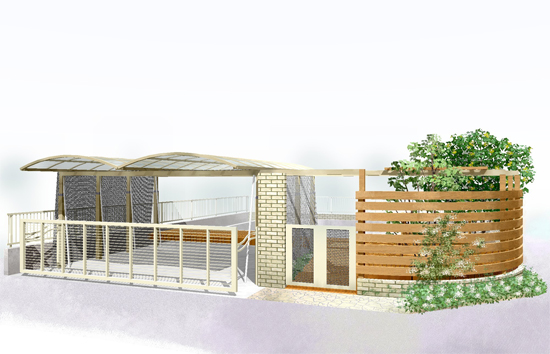 印象的なカーポートが中心の若々しいデザイン。海辺のそばの邸宅のエクステリアのイメージです。デッキでくつろぐ時間もゆったり流れます。