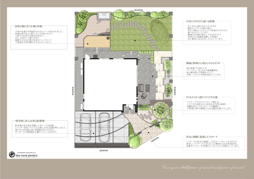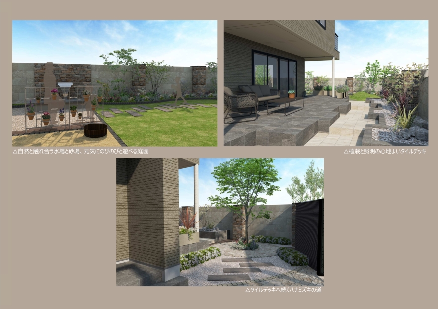 子供達が飽きずに遊べる庭にする為にどの様にしたら遊んでくれるか、喜んでもらえるかを考えながらデザインをしましたので考えるうちに私自身が楽しくなりあれやこれやと思い浮かんだことをまとめるのに苦労しました。