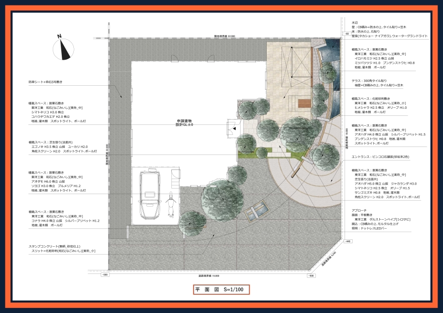 建物と外構の作成は平面よりも立面を意識したプランとなっているため、どの場所からも視覚として存在感がありながらも落着いた雰囲気もある構造物、樹木が楽しめるように細部にもこだわりながら作成しました。