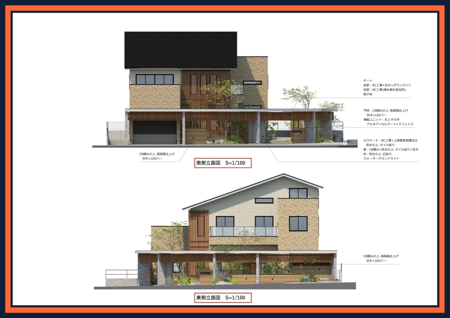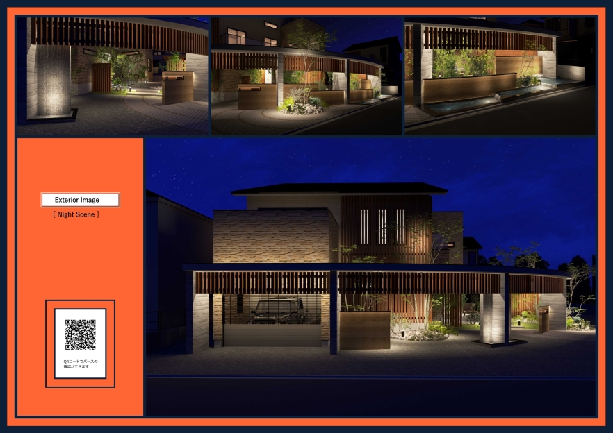 また細かな高級感を表現するためにもRC壁は焼杉化粧型枠、門柱等は版築風仕上、一体感を持たすために外壁ルーバー材に合したゲート下格子、角柱スクリーン、壁泉や水辺の水景では細かな水の流れも表現しています。
