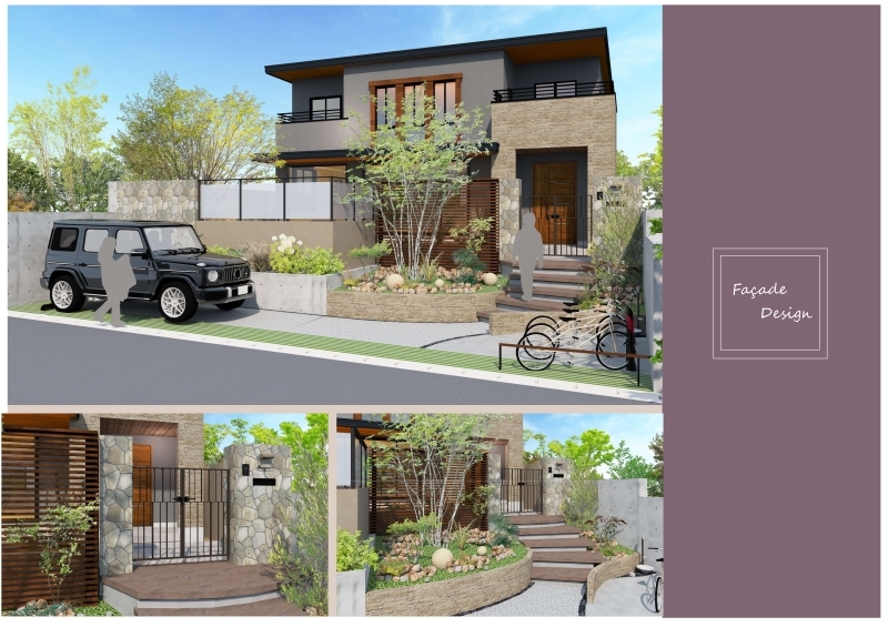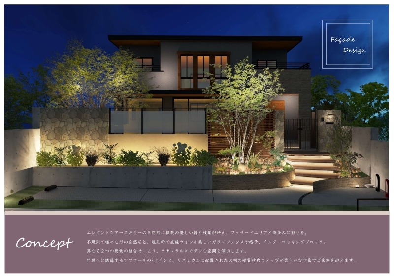 アースカラーの自然石に植栽の優しいグリーンと枝葉が映えるファサードエリアは、街並みにも彩を添えます。