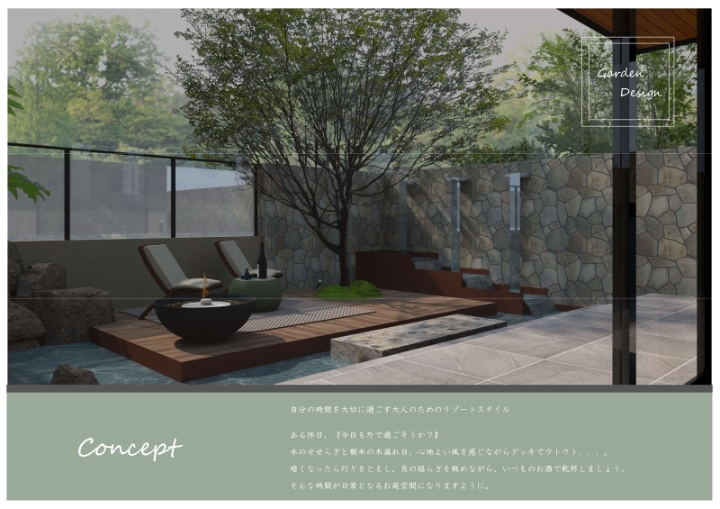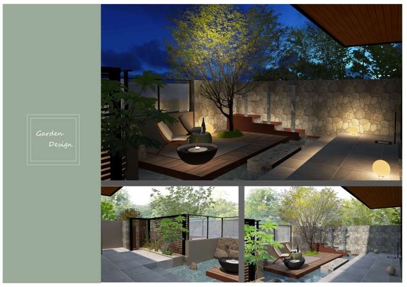 水音が静かに響く大人の庭空間がこの作品の中心です。