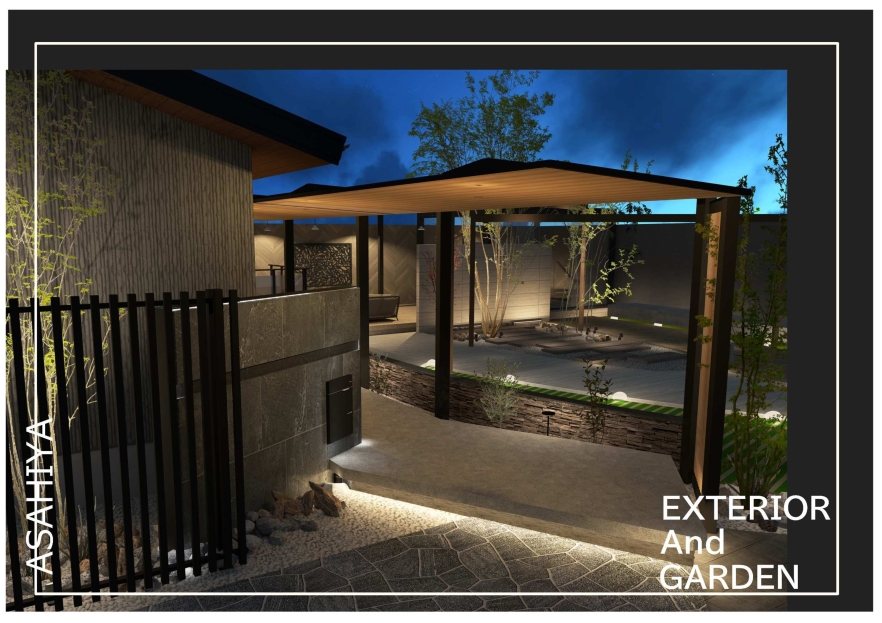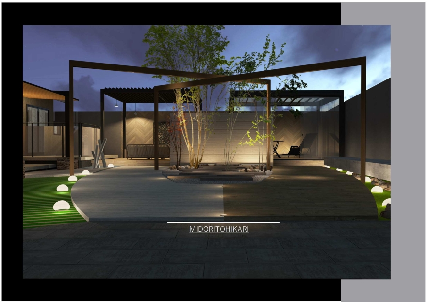 奥にテラスでくつろいだり、BBQなど楽しめるスペースを確保し、階段を下りれば癒しの緑と高級感を演出する装飾品をたくさん使用し夜のライトアップスタイルで異空間にご招待。