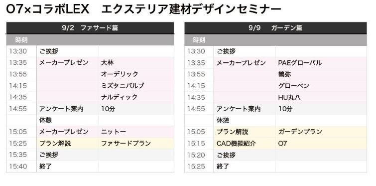 | 9/2(木) 13:30〜15:40 | ・ファサード編 参加メーカー商品を使ったプラン解説 参加メーカー 大林株式会社・オーデリック株式会社・ミズタニバルブ工業株式会社・株式会社ナルディック・株式会社ニットー |