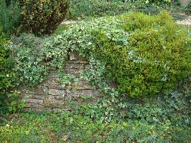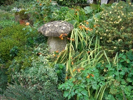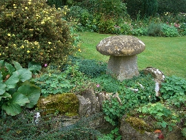 昔の穀物倉庫の束石ねずみ反し。これが結構値段が張るんだそうです。4つあったのがある日2つ盗まれてしまったそうです。新しいものも作られているようですが苔むすものでないとつまり古くないと価値がないんだそうです。イギリスの庭の美しさの評価に石に苔むす風情をよしとする気持ちがあるようです。