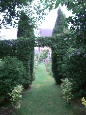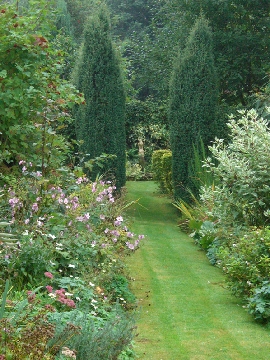 往きの径は芝生で敷き詰められています。2本のコニファーは隠れた庭の門としての演出でもあり道のイメージをしっかりさせている効果がありました。巧みな演出です。