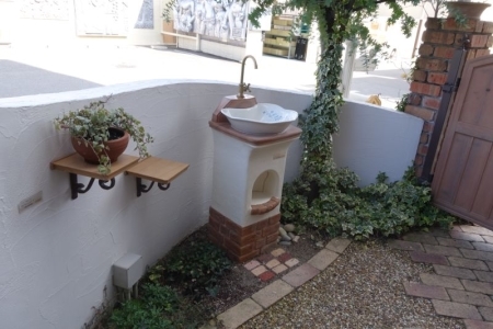 リリーの本体は、耐候性のあるFRP製。ポットなどを飾れる棚も。リアリティのあるレンガと塗りのテクスチャが庭の他のアイテムとの一体感を高めます。