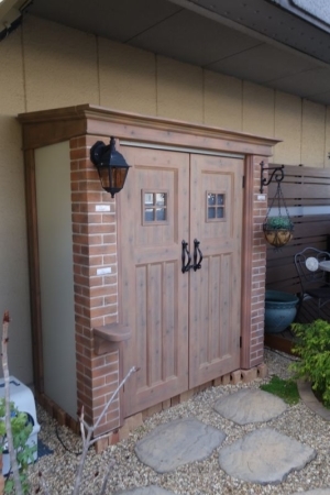そしてこちらは、オシャレな庭の物置の概念を変えてしまったと言われる、カンナ。そう、こちらも鋼製の本体に、FRP製のドアと屋根、レンガ調の飾りで構成されてます。レンガ色と木調色の組み合わせで、南欧風のお宅から、イングリッシュガーデンまで幅広く対応します。