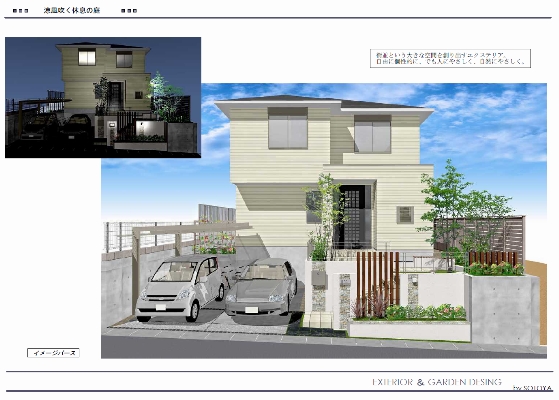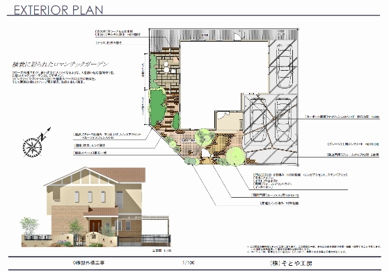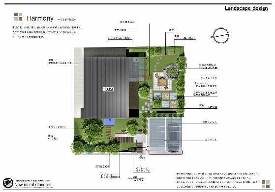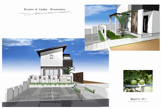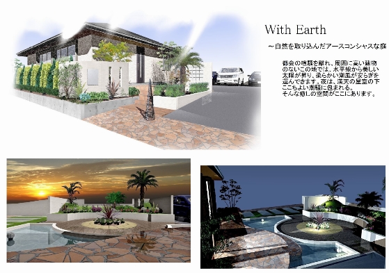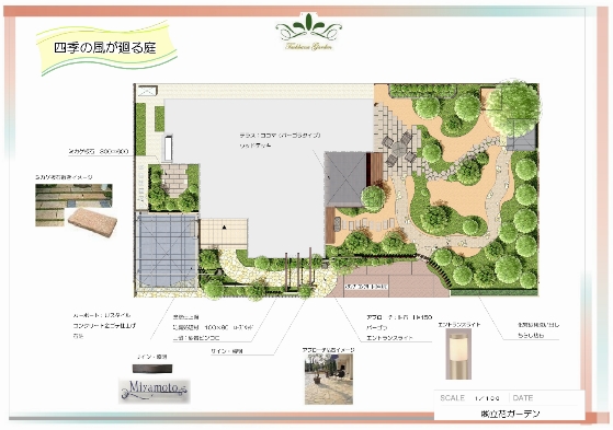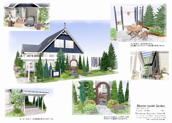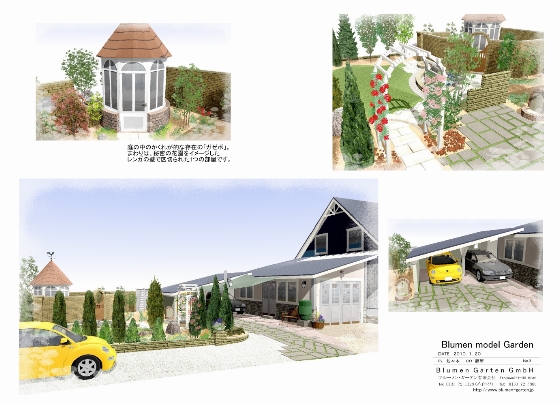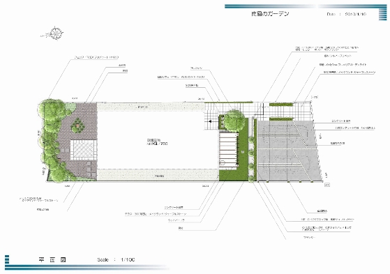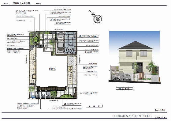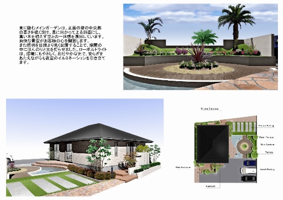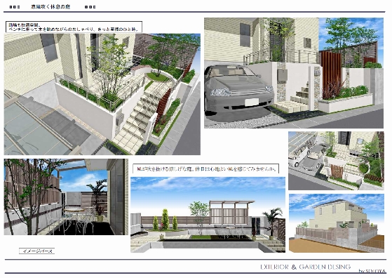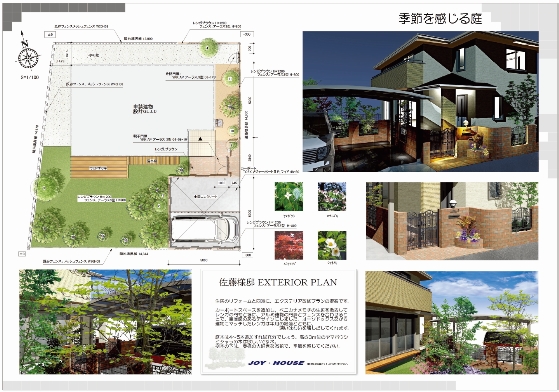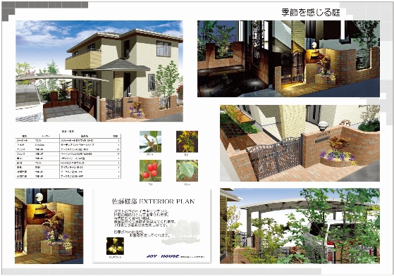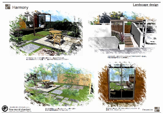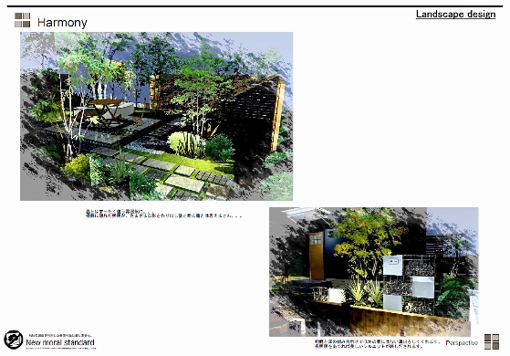 この「季節を感じる庭」は、A3という紙の世界で、それをやってのける勝負強いものがありました。提案図面の天地左右の余白や縦横斜めのレイアウトなど「図面表現のいろは」を しっかりと守られ、コンセプト(メッセージ)の配置も、部分パース等の門扉の金属の質感やレンガのそれも、お施主様に見て取れるように≪視点≫を決めておられます。特筆すべきは フォト樹木を用いて樹木越しに庭の部分を眺める提案をしておられるところ。庭を作ってもらった後でお施主様が≪感じるシーン≫を、添えているところが心憎いです。≪1日の庭と外構≫の一つ一つに気配りをしたプレゼンテーションは清々しく、説得力がありました。