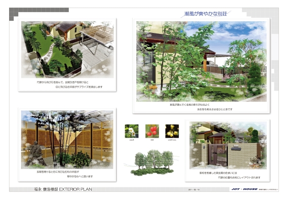 庭を駆け抜ける風と、木漏れ日、そして揺れる木立と葉の群れ。これらがA3版プレゼン用紙に溢れている作品です。いつもながら、潮風の通り道を爽やかにイメージさせるパース視点とトリミングの巧みさが伝わってきます。とりわけ、フォト樹木をズームアップしながら庭の【庭らしさ】を絞り込む構図には、作者が語る「永住をも考えさせるひととき」を髣髴とさせる魅力があります。外観デザイナーによる建物(外観)作図のスキルの高さも拝見させていただきました。いつも「オーセブンCADで表現できる」ところを引き出していただき感謝します。