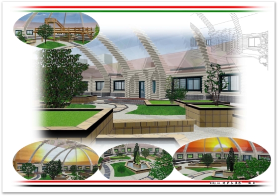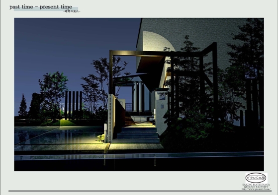 …… この作品の素晴らしいところは、展示場(庭とアプローチ)のプレゼンに徹した、建物を引き立てる【心憎いお洒落感覚】のあるところ。CADによるあらゆる【表現】が駆使され、脇役に徹しながらも、物語られているところです。例えば、窓庭の詳細設計はもとより、プレゼンパースの周辺にラフなタッチを入れて、それが暴れすぎないように、控えめな影を添えた額縁(線)。奥ゆかしいライトグレイッシュカラーと線の構成は、【デザイナー気質】そのものです。合計5枚(A3版)からなる作品は、そうした作者のこだわりが、アプローチデザインにも存在する力作でした。そして、玄関アプローチから坪庭に及ぶVRの撮りかたに脱帽です。VRプレゼンが効果的に伝わってきました。