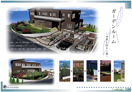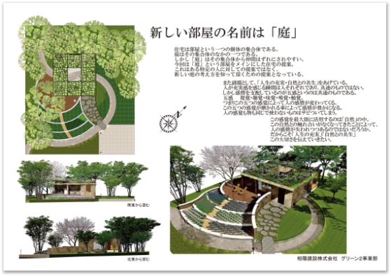 広い敷地のエクステリア空間に【8つの提案】がある作品です。審査会場に並ぶA3プレゼン用紙では、作品が伝えたがっている〜四季と住まう庭〜を伝え切れないのではないか。 ……そんな思いで審査させていただきました。