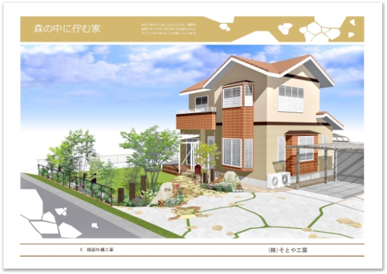 | この度はO7賞をいただき、誠にありがとうございました。 普段から使っている手法として、オーセブンCADで作成したパースを画像保存し、それをMS-wordに貼り付けてプレゼンシートを作成しています。それにより作図時間の短縮と見せ方の自由度が大幅に向上しています。また、オーセブンCADを導入して間もなく2年が経ちますが、昨年春からは新たに私の妻がオーセブンさんへ研修に行き、その甲斐あって敷地と時間のかかる住宅部分や特殊なパーツ等は妻が作成、それを元に私が外構デザインをつくっていくという役割分担で作業をしています。オーセブンさんには日頃よりきめ細かく、温かなサポートで助けていただきとても感謝しております。今後とも弊社を宜しくお願い申し上げます。 | ![]() |