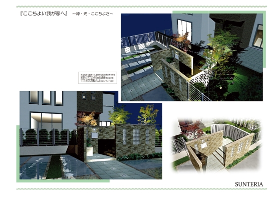 「ここちよい我が家へ」で、審査員の目に留まったのが、副題〜緑・光・ここちよさ〜にある、フェンスを通過する宅内からのライトや、アプローチ床のタイルライト、そしてスポットライトを浴びる樹木や空洞ブロックからの光のコラボレーションでした。……これらは、ご家族が一日の仕事を終えて最終ゴールである我が家へ帰ってこられた時の【思い=ここちよさ】そのもので、静かな…大きな…包容力がありました。パースの撮り方も、玄関先の構成的なアプローチを道路側から2つの視点で追いかけておられ、そのまま1枚のプレゼンシートに【夜景】で収めていらっしゃいます。迫力があり、Art賞につながりました。