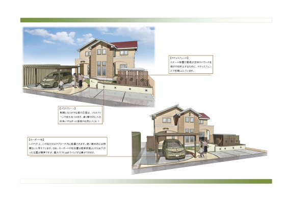一見、どこにでもあるオープン外構ですが、洋風の玄関アプローチ上に置かれた自然石と、それを囲む下草、低木、高木の絶妙な配置と高さの関係に美しさを見た作品です。8視点から撮られている玄関アプローチ・パースからは、【自然石】【下草】【低木】【高木】の組み合わせと、建物、機能門柱、ポストの配置バランスのよさがキッチリ掴み取れます。07賞につながる力作でした。