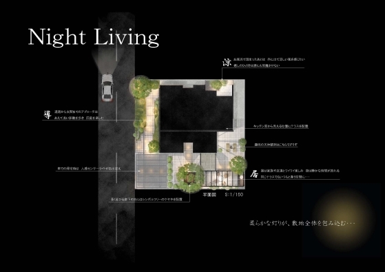 「白い背景」にレイアウトする「夜景パース」は、その存在感をしっかり残せますが、「黒い背景」を使った作品「Night Living」は、そのダル・トーン(黒)に埋もれることなく、それ以上の存在感を示していただきました。特に、3ページ仕立てのすべての制作物に美しいライティング仕上げを完結させていますが、平面図のライティング効果の示されかた(表現力)は圧巻でした。
