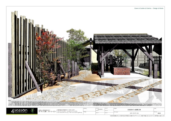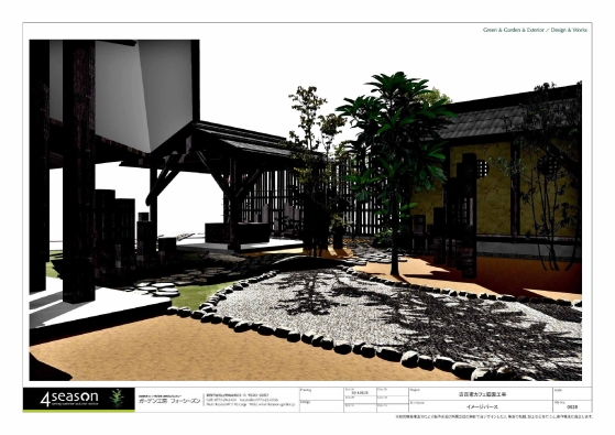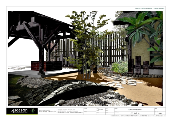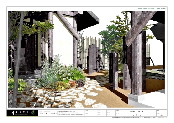 古民家カフェの外構という事で、雰囲気を壊さぬよう自然で心安らぐようなお庭を目指しました。古民家が建物デザイナーで再現できなかったため、eE-Formerを使い描き上げました。eE-Formerは、細かなところまで描き込めるので良く活用していますが、今回は特に様々な箇所にeE-Formerを使い、精度を上げました。