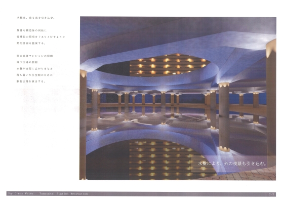 プレゼンテーション力が高く、提案力のある作品です。大学生になりますと、やはり実力がつきますね。蛇籠を使用した可動式の植栽プランター、壁面緑化など環境へ配慮した提案がわかりやすく表現されています。水盤と夜の明かりを取り入れた照明計画も素敵でした。日本古来の造園技術である蛇籠の良さ、水と緑が人々に与える印象の役割を現代風にうまく取り入れたプランをわかりやすく提案できている作品です。