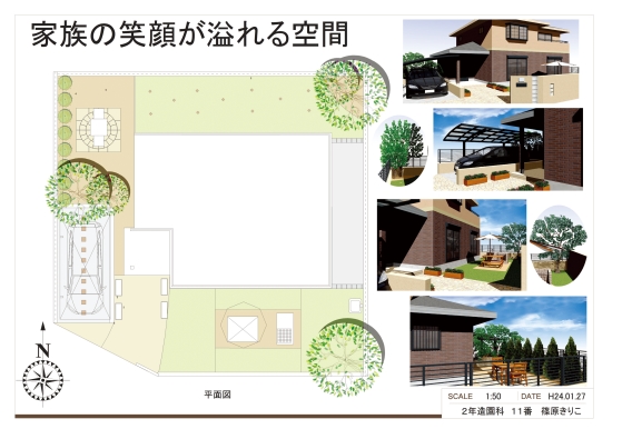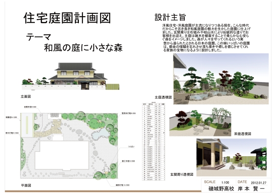 この作品は そういう意味で、幾度も【頭の中のイメージ】を【CADで描いて見る】が繰り返され、練りに練られた庭づくりであったと思います。【リビングダイニングルームからの眺め】や【和室からの眺め】には、そこに暮らす住人の憩える庭がシッカリ描かれています。庭づくりを学ぼうとする、楽しく活き活きとした強いエネルギーをいただきました。(CADが教育現場で使われ 学生さんが素晴らしい作品を作っている現状を知ることができました。ありがとうございます。)