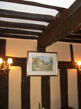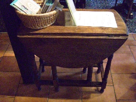 穴ぐまホールの壁と天井、500年の歳月を超えていまだ健在。壁に掛けた絵の額縁はいただけない。ないほうがいいかもしれませんね。テーブルは古そうでいいです。