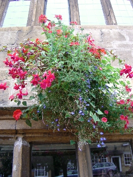 外壁に掛かるハンギング。赤い花、紫の花。室内の窓から見るハンギングの花はなかなかいいもんですね。
