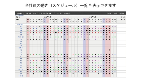 社員も職人さんも、明日誰が空いているのか、誰が忙しいのかが、ひと目で分かります。 予定の割り当てを的確に行え、追加・変更・削除を本人にメールで確実に伝えることができます。 ![]() |