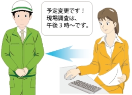 具体的な指示が新人の業務スケジュール表に入力(連絡)されますので、新人の現場担当でも間違いのない作業にかかれます。そしてその指示は、他の関係者も見ることができます。 |