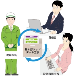 | 電子カンバン「e-Board」を介して 成約するまでの、現場と事務所の「鈴木様邸ウッドデッキ工事」のやりとり |