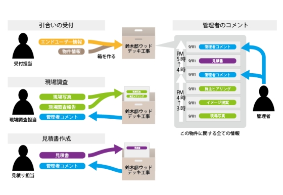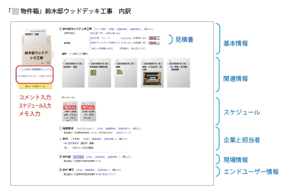 新人の現場担当による現場調査結果を受けた事務所は、1時間以内にお施主様にお渡しする見積り作業に入れます。 午後3時〜午後4時の現場の動き ・現場から施主ヒアリングと現場写真を「物件箱」へ ・ネットプラ10のテラスイメージ提案も「物件箱」へ 午後4時〜午後5時の事務所の動き ・会社からお見積りを「物件箱」へ |