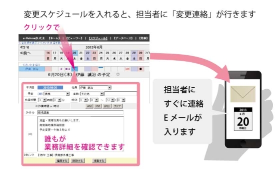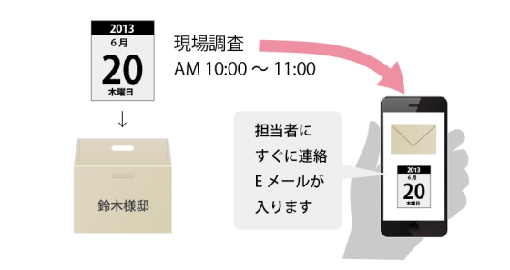 | 責任者が鈴木様邸の現場調査スケジュールを入れると・・・ 担当者に届きます。 |