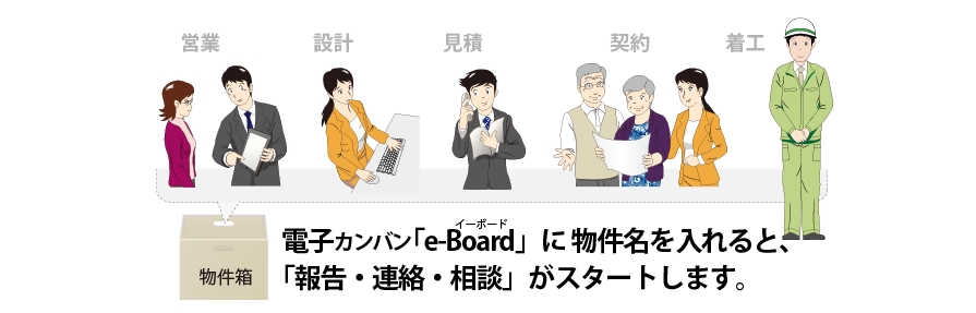 「いつ」「どこで」「誰が」「いつまでに」「何をする」かを「物件箱」で整理整頓できる電子カンバン「e-Board」です。仕事のひとつひとつを「スケジュール入力」という手段で業務工程を安全管理できます。 |