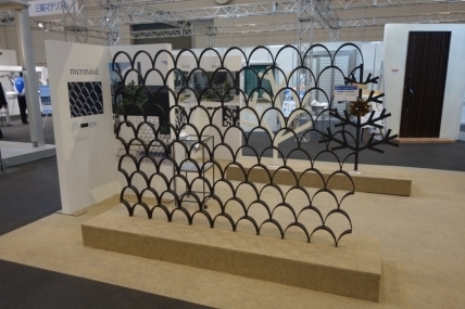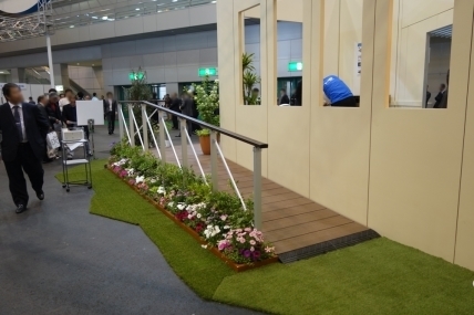 さきほどスマーレのところにもありました、人工木デッキ「ひとと木2」。今回は大幅な改良が施されてます。まずはこの展示からわかるように、スロープ仕様の追加。バリアフリーとなって、お年寄りでも庭に降りて楽しみやすくなったのはもちろん、小型犬と暮らすペットガーデンのある生活でも活躍しそうです。なお手すりは独立仕様。幕板の設置部分は現場加工が必要なようです。