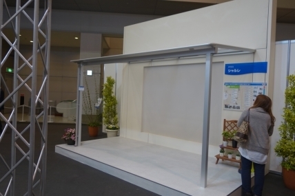 マイリッシュOKの隣には、折板屋根カーポートG-1ssが展示されていました。昨今の異常気象で、耐風圧、耐積雪強度の高い折板タイプのカーポートが人気です。自然、デザイン性の高いものも選ばれるようになってきています。
