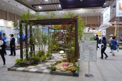 ![]() | ![]() 福岡エクステリア建設業協会による、モデルガーデンコーナー。アーチを飾るのはYKKAPのカスタマイズパーツ。石材に緑と水景を上手く組み合わせています。 |
