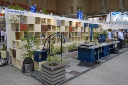 ![]() エクステリア建材総合商社のオリジナルブランド エクシスランドのブース。主に石材と、エクシスランドブランドの樹脂製板材Eウッドスタイルの展示。 | ![]() |