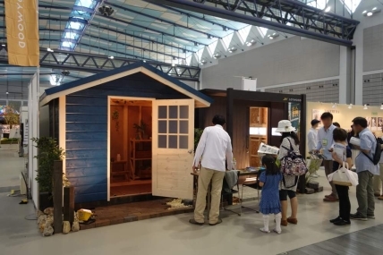 ![]() | ![]() 北海道の木材工事、国政建材メーカー山田木材ブースでは、オリジナルブランドのJOYWOOD 木製物置を展示。青いモデルは北海道産松を用いたPITCHというタイプ。 |