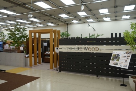 ![]() | ![]() ここで一旦エバーアートウッドゾーンへ。アルミ形材に木調だけでなく様々なテクスチャをラミネートしたエバーアートウッドは、天然素材の制限を離れ、様々な可能性を示してくれました。 |