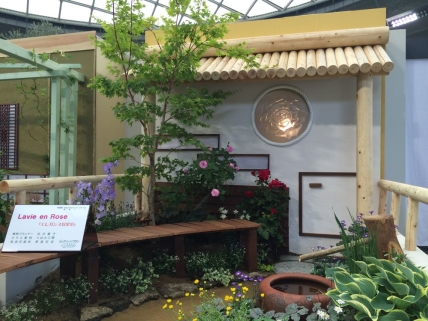 ![]() ♥樽 caffe♥ 〜heart&harb〜。埼玉県立熊谷農業高校プロジェクトチーム作品。奨励賞。 味噌樽を使ったという扉がとてもユニーク。色を鮮やかな青にしているのもいいですね。 | ![]() 今とここ〜一瞬の季〜。千葉の有限会社あかざさんの作品。優秀賞。 苔庭、延べ石や砂紋、景石など和の素材を使い、古木と水景にバラを融合させた作品、なんとも見事です。 | ![]() 野点日和。埼玉 シツラエさんの作品。奨励賞です。埼玉から長野に引っ越した定年後のご夫婦の住まいという設定。草花の扱いがとてもナチュラル。テーブルウェアも派手すぎずしっくりときています。 |