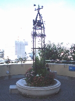 階を降りて、テラスを散策していると、イングリッシュガーデン風のフラワーアレンジされた風見を発見。背景の建設中の新築ビルとのミスマッチに思わずパチリ!ちなみに座って読書中の金髪の英国人風のお姉さんは、正面に回ってみると、なんとふつうの日本人でした・・・大阪らしいオチですね。