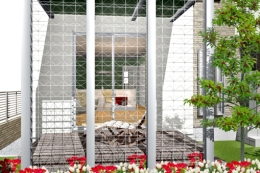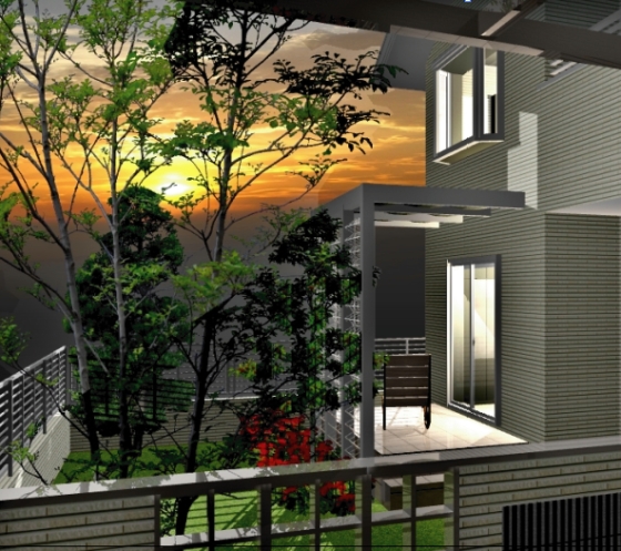 例えば リビング・テラスまわりをアピール 南向きのテラスに、遮光植栽ネット付のパーゴラの提案例です。 上からテラスを見下ろすパースには、リビングルームの空間を共有しているテラスがあります。 |