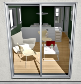 【建物デザイナー】 部分作図だから、速くて簡単。 建物外観の中に、必要な部屋だけ書き加えることができます。 内観入力も、とてもスピーディです。 例えば庭に通じる掃き出し窓のある、リビングルームだけ内観作図です。 |