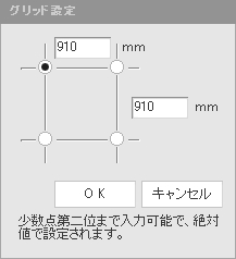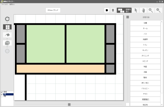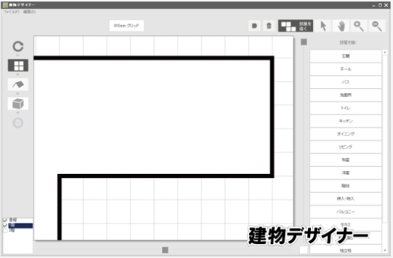 【建物デザイナー】起動 建物デザイナーには、オーセブンCADで描いた基礎の形状が読み込まれます。 この基礎形状の中に、パースに必要な部屋を書き加えることができます。 ▼グリッドの調整可能 ![]() |