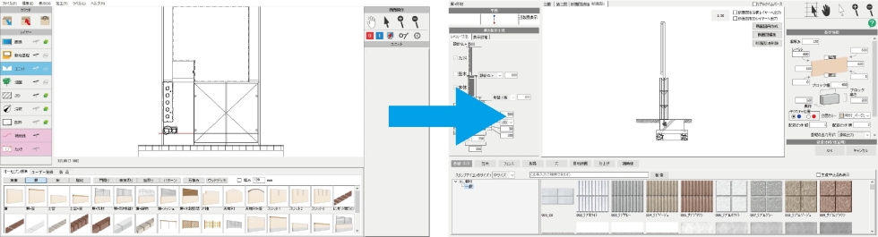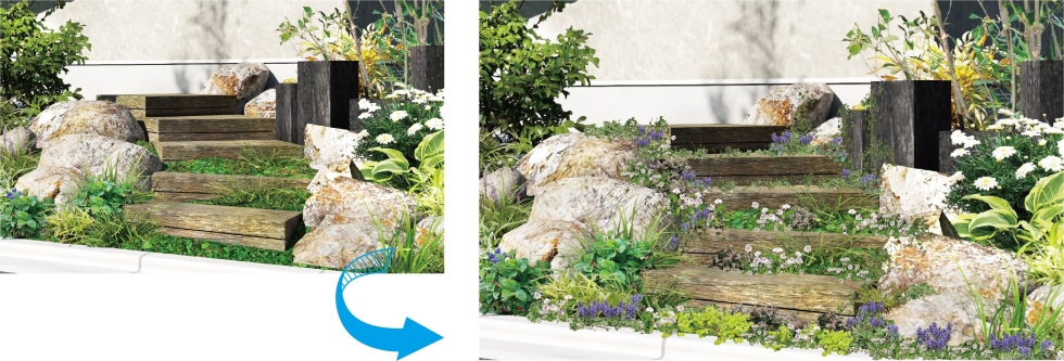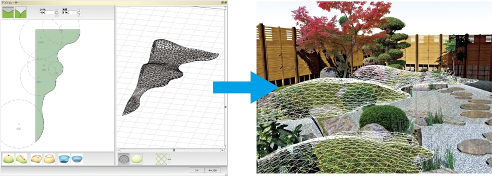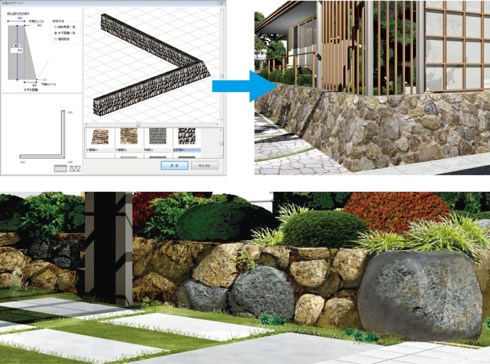 不揃いの石の組合わせや、切り石など、本格的なプロの仕事を表現できる専用ツールを搭載。台形的な間知や擁壁の3D図形を簡単な入力だけで作成できます。側面と天端の素材(テクスチャ)が連動するので、美しく仕上がります。造園設計に欠かせない「石」を学習しながら、プランに取り入れることができます。