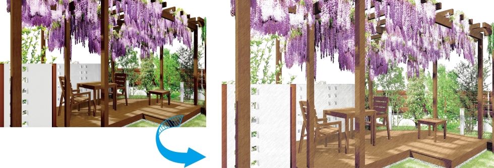 ワンタッチでパース画像を加工したり、絵具タッチの水彩風や手書き風などの筆を使って、自由自在に表現できます。レタッチ機能はパース画像と連動しているので作業も簡単!授業を楽しくします!
