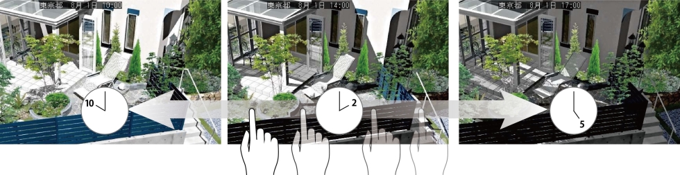方位、都道府県、月日を指定すると、自動で「影シミュレーション動画」を作成します。影による「日なたと日陰」が樹木にあたえる影響なども同時に学ぶことができます。