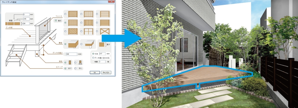 簡単な形状から複雑な形状まで、平面形状のウッドデッキを選択するだけで作成できる特別なツールです。デッキの断面や幕板など細部にわたる調整が可能で、自由な形状も即、ウッドデッキに様変わりです。設定画面で形状や仕組みを確認しながら設計できます。