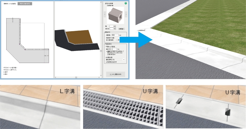 道路を作成する専用ツールを搭載です。ワンクリックで敷地形状に道路を設定できます。L字溝やグレーチング付U字溝など、ワンタッチで切り替わり、道路勾配も自動計算します。