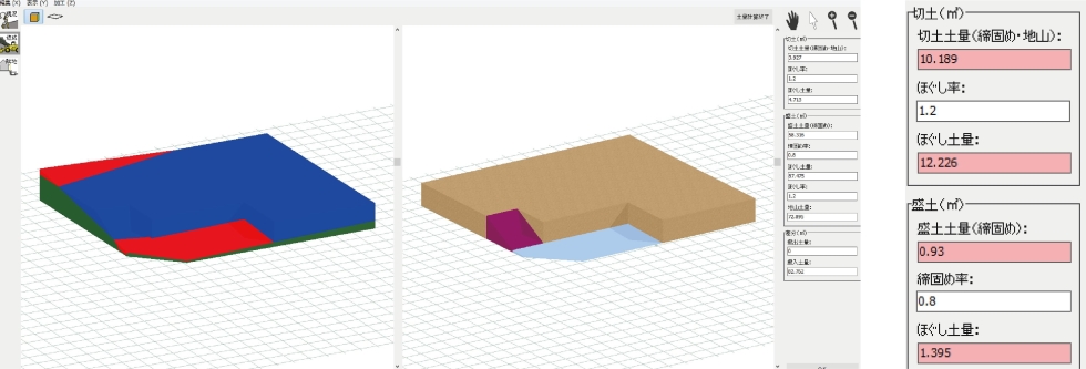 現況の宅地レベルと造成後の状態を入力すると土量として計算します。土量は「締固め率」「ほぐし率」を掛けた値を自動で計算するので、必要な基礎的要素の学習に最適です。計画レベルを入力することで作図を補助する高低差の設定もできます。
